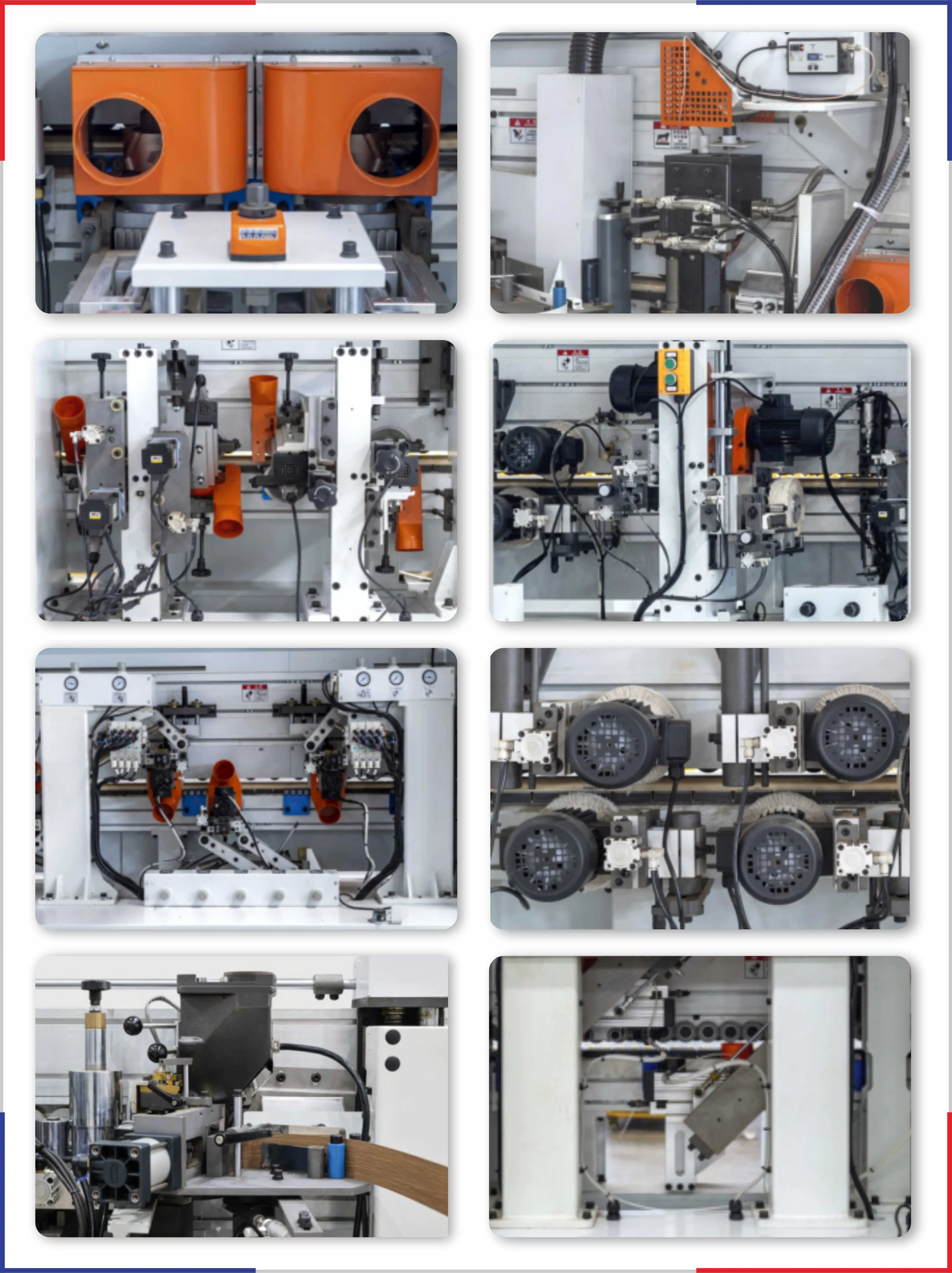 - High Precision and Efficiency With advanced automation, the machine is capable of producing consistent edge banding results with minimal human intervention. The use of high-quality motors and pneumatic systems allows the machine to operate with great precision, ensuring that the edge banding is uniform across all panels. The feeding speed is adjustable between 15 to 23 meters per minute, depending on the production requirements, providing flexibility and efficiency for various batch sizes.