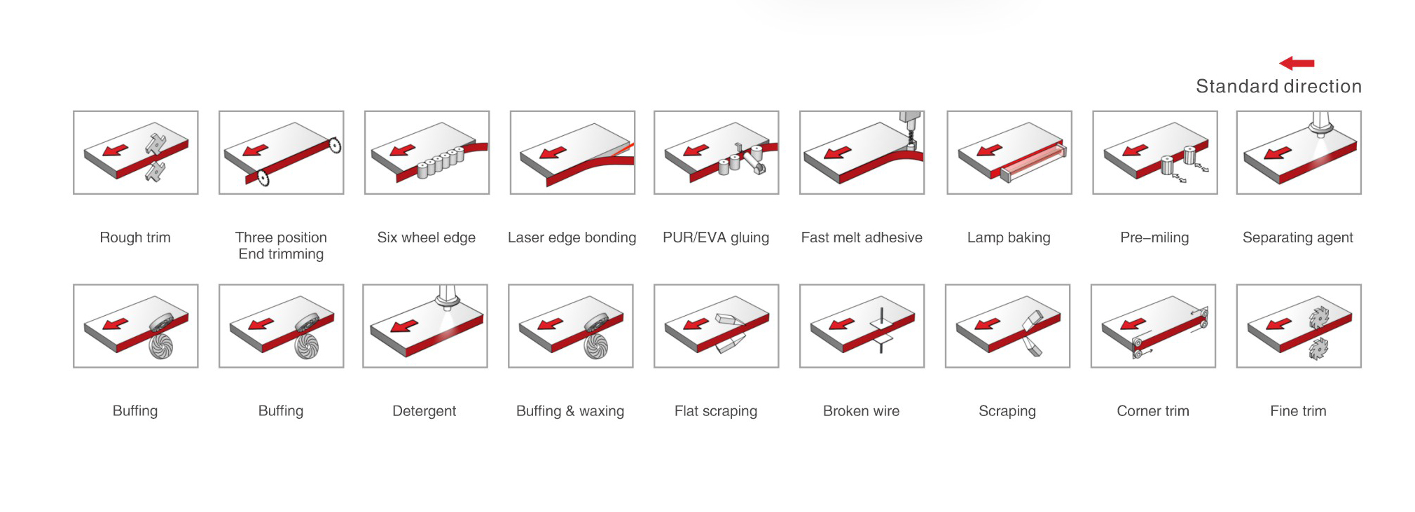 Advanced buffing stages follow, delivering a pristine, polished surface that amplifies the refined aesthetics and tactile experience of the final product. Buffing and waxing contribute to the surface’s sheen and protection, ensuring the panel edges retain their beauty and robustness over time. The integration of detergent application serves to cleanse and prepare surfaces meticulously, enhancing adhesive quality and surface cleanliness.
